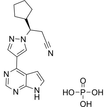碳原子结构式:C17H21N6O4P, 碳原子结构量:404.36, 饱和度: > 98%, 融掉性: (R.T.: 25℃): DMSO, Ruxolitinib phosphate (INCB018424 phosphate) 一种 JAK1, IC50 区分为3.3 nM/2.8 nM,比JAK3会选择性好130倍。