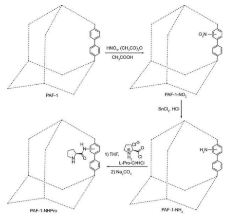 将手性脯氨酰胺催化位点通过一系列后修饰的方法固载到PAF-1的骨架上,得到了新颖的手性固载催化剂PAF-1-NHPro