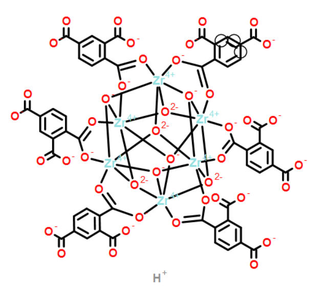 碳原子式:C54H22O44Zr6.H6 碳原子量:1928.12 配位复合 Zr 配体 偏苯三酸 (CAS:528-44-9) 口径 0.8nm, 1.1nm 孔容 比表明 BET比表明600-700m2/g