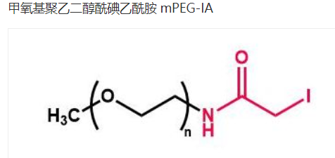 碘乙酰基(IA)作用化的聚乙二醇(IA PEG)是硫醇(-SH)基反馈性PEG具象化物,能够用于根据其能够用的硫醇基团表达怪物碳原子或另另一个村料。 碘基很比较容易被硫醇基结合在一起,产生另一个比较稳定的碳硫醇键。成分式:
