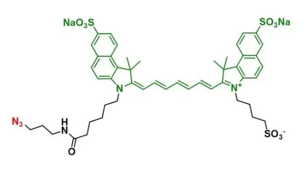 DiSulfo-ICG-azide常用的生物标记基团,作为近红外荧光染料,ICG染料比CY系列的花菁染料毒性更低,安全性更好及更的光稳定性,ICG是一种带负电荷的聚甲基菁染料,跟CY3,CY5,CY7这些菁染料不同的是他有这更高的吸收和发射波长,它的波长是800nm。