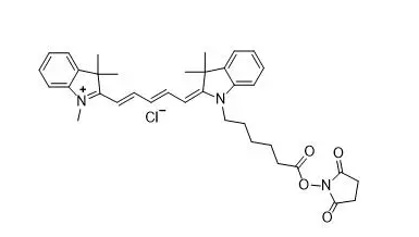 Cy5-NHS ester,Cy5-虎珀酰亚胺/产甲烷酯,Cyanine5-NHS ester,Cyanine5-虎珀酰亚胺/产甲烷酯的外观 :深暗蓝色液体CAS号 :1032678-42-4碳原子式 :C36H42ClN3O4原子量 :616.19ex/em :640/664nm (PBS缓存数据液)消光常数(ε) :250000 L⋅mol−1⋅cm−1量子劳动生产率(Φ) :0.2容解性 :可溶于DMF等无机稀释剂保持要求 :遮光,烘干,-20oC保持公路运输状况 :室内温度