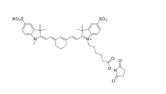 Sulfo-Cy7 NHS ester就是种近红外水可溶亲水活性染料,也就是种中用胺基渗透型的NHS酯。Sulfo-Cy7 NHS ester构成一位三甲医院基炔桥,并有位连结臂,中用其连结到球蛋白,多肽和各种分子式。Sulfo-Cy7 NHS ester可中用近红外影像应用的研发。繁体中文各称:水阴离子型七甲川花菁颜料标上活力脂日语种类:Sulfo-Cyanine7 NHS ester名字简称:Sulfo-CY7 NHS esterCAS:1603861-95-5的外观/Appearance:墨绿色粉丝/dark green powder氧分子结构/Molecular formula:C41H46N3KO10S2大分子量/Molecular weight:844.05纯净度:95%+可溶性高,溶解水的性:溶解DMF,DMSO,水