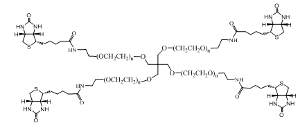四臂PEG生物素是一种多臂PEG衍生物,四臂的每个末端都有生物素基团连接到一个季戊四醇核心。PEG生物素可通过与链霉亲和素和抗生物素结合进行聚乙二醇化,具有高亲和力和特异性。